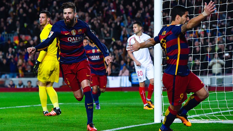 Messi, con un espectacular golpe franco (minuto 31), y Piqué (48) protagonizaron la remontada azulgrana al gol de Vitolo (20) en un duelo entre el actual campeón de la Liga de Campeones (Barcelona) y el vigente doble ganador de la Europa League (Sevilla).