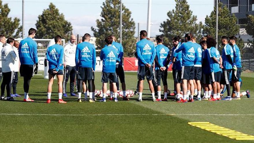 En una foto difundida por el club 'merengue' se puede ver Zidane, acompañado de su cuerpo técnico, dando una charla a sus jugadores, colocados delante de él, entre los que se distingue, entre otros, a Gareth Bale, Keylor Navas, Marcelo o Francisco Alarcón 'Isco'.
