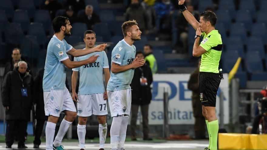 Avisado por el VAR, el árbitro consultó las imágenes al borde del terreno de juego. Sacó una tarjeta roja a Inmobile pero no decretó el penal a favor del Lazio.