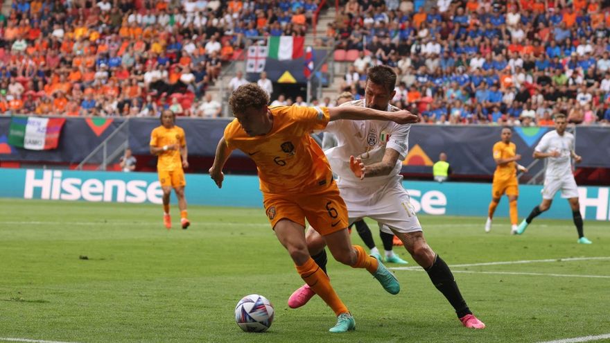 Los hombres de Roberto Mancini se adelantaron pronto cuando Giacomo Raspadori dejó de tacón en el área para el disparo de Dimarco que se coló por la escuadra de la portería neerlandesa (6).