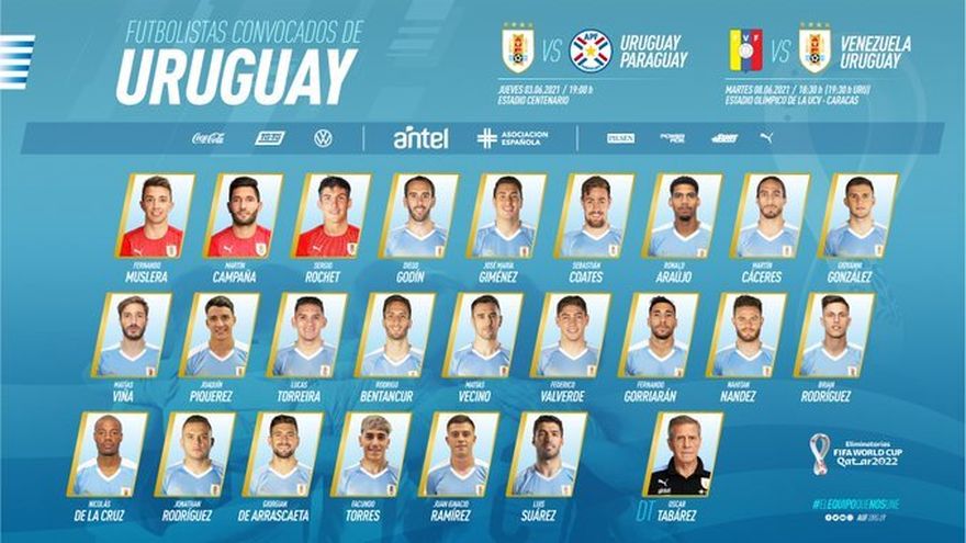La selección uruguaya difundió este viernes la lista de elegidos por el entrenador Oscar Tabárez para enfrentar a Paraguay de local el jueves 3 de junio y Venezuela de visitante el martes 8.