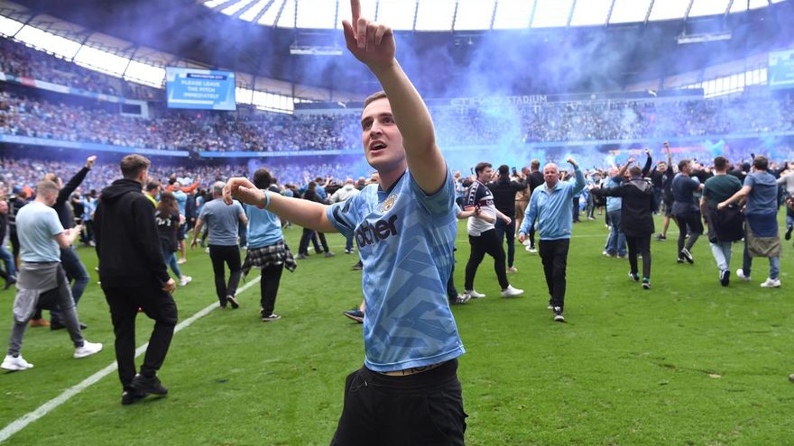 Muchos aficionados invadieron el césped tras la victoria del Manchester City 3-2 frente al Aston Villa, un triunfo que le permitió conquistar el título con un punto de ventaja sobre el Liverpool.