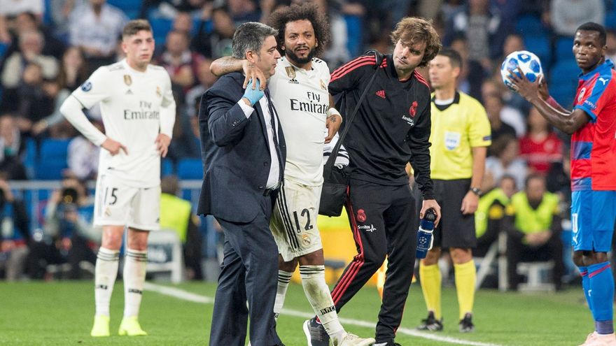 El lateral izquierdo brasileño, que marcó uno de los dos goles del Real Madrid al conjunto checo, sufrió una entrada de Ubong Ekpai en el minuto 87 cuando intentaba despejar un balón.