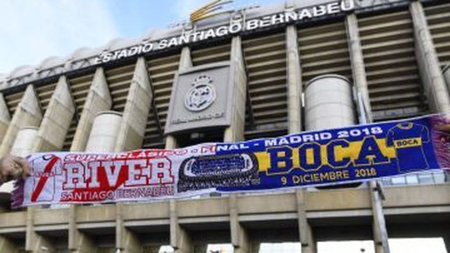 Pocas horas antes de la final de la Copa Libertadores entre el River Plate y el Boca Juniors en el Santiago Bernabéu son muchos los que buscan llevarse un recuerdo de una jornada que pasará a la historia del fútbol sudamericano.