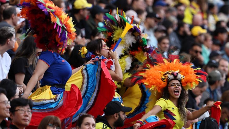 Espectáculo sobre el terreno y en las gradas: Colombia, impresionante desde el inicio del Mundial femenino, está dejando huella también en las gradas de los estadios por los que pasa gracias a la marea amarilla de aficionados.