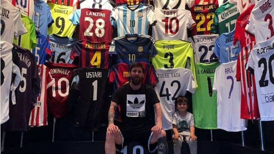 Entre la multitud de elásticas, con varias de las suyas en el centro de la imagen, destacan nombres ilustres de la historia del fútbol y de grandes rivales: Totti, Casillas, Raúl, Henry, Deco. Incluso también de algún jugador con el que ha compartido vestuario, como Piqué, Fábregas, Agüero, Lavezzi y la de su gran ídolo de infancia, Pablito Aymar.