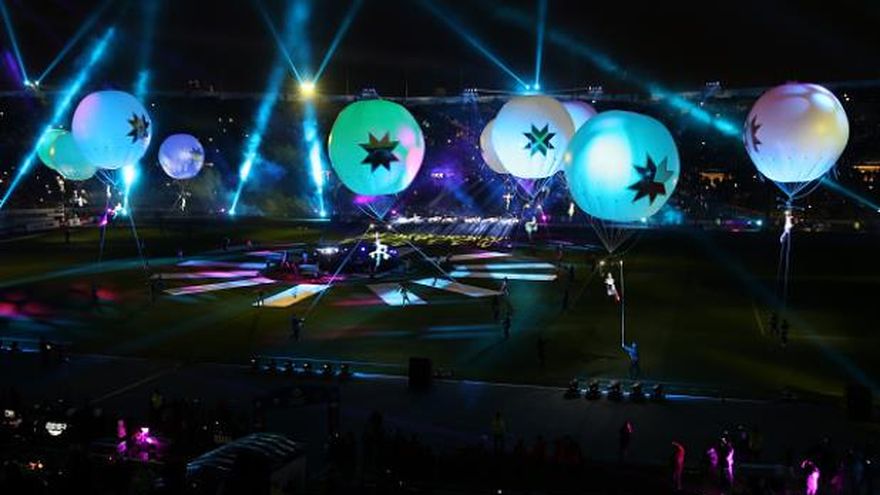 Acompañado de un crescendo musical, el cilindro se fue abriendo y de su interior emergió una colosal Copa América inflable de ocho metros de altura que desató una verdadera eclosión eufórica con unas ovacionadas llamaradas.