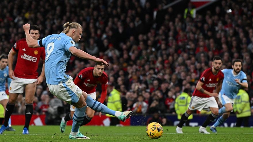 El City se adelantó pronto en el estadio de su vecino, después de una falta de Rasmus Hojlund sobre Rodri en el área. El primer penal de la historia concedido a los 'Sky Blues' en Premier League en Old Trafford fue convertido por Haaland en el minuto 26.