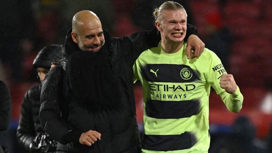Erling Haaland (d) junto a Pep Guardiola (i), técnico del Manchester City / AFP