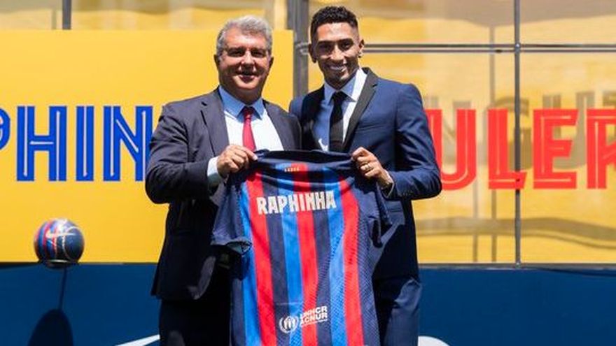 Laporta entregó a Raphinha una camiseta del Barça con su nombre, pero sin dorsal, a la espera de que le atribuya uno, y después ambos firmaron ante las cámaras el contrato que convierte al extremo brasileño en nuevo jugador azulgrana.