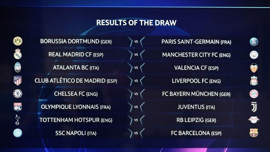 Además el Borussia Dortmund desafiará al PSG, el Chelsea jugará frente al Bayern Múnich, la Juventus de Cristiano Ronaldo se las verá con el Lyon y el subcampeón Tottenham jugará con un equipo que toca por primera vez los octavos, el Leipzig, líder de la Bundesliga.