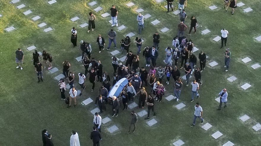 Frente a la tumba, al lado de la de sus padres, amigos y familiares estallaron en aplausos, según imágenes registradas por drones y transmitidas por el canal TyC.