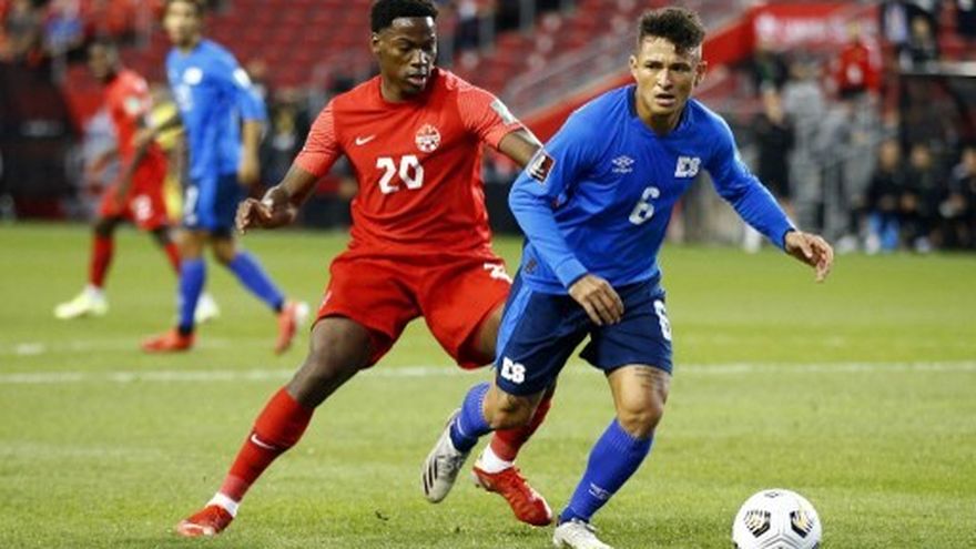 Jonathan David (20) lucha por la pelota con el salvadoreño Narciso Orellana. / AFP