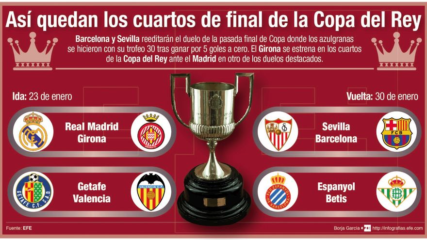 Sevilla-Barcelona, la reedición de la última final, y Real Madrid-Girona son los emparejamientos más destacados de los cuartos de final de la Copa del Rey, según el sorteo celebrado este viernes en la Ciudad del Fútbol de la Federación Española.