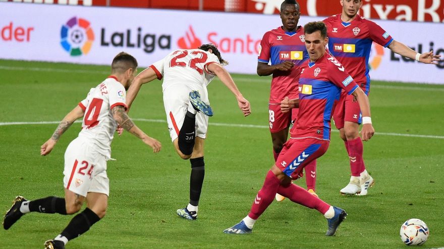 Con goles de Youssef En-Nesyri y Franco Vázquez, el Sevilla dio cuenta el miércoles 2-0 del Elche para afianzarse en el cuarto puesto de la Liga española.