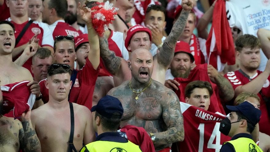 En fotografías difundidas por la AFP se ve cómo dos empleados se dirigen a dos aficionados en la grada de los daneses y agarran la bandera en cuestión. Uno de los hinchas tiene en la mano un vaso con los colores de una marca de cerveza.