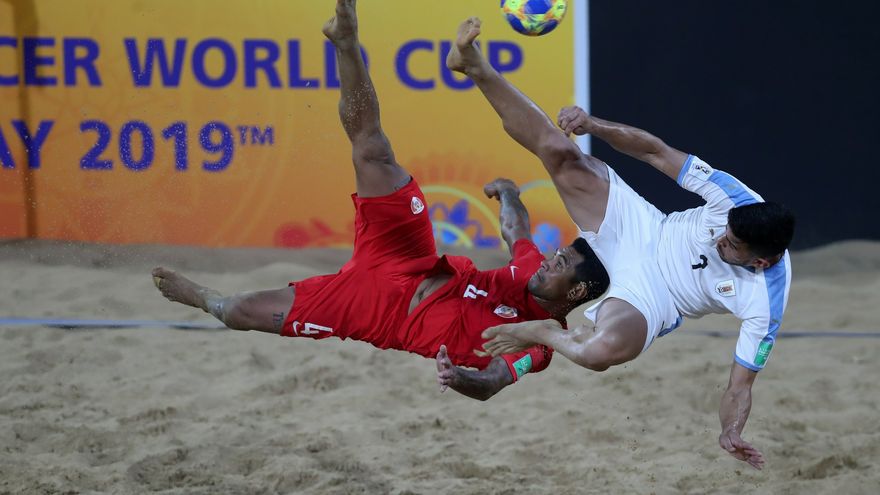 Un gol de Nicolás Bella a tres minutos del final permitió a Uruguay acceder a los cuartos de final del Mundial de fútbol playa, pese a caer por 6-4 ante Tahití, subcampeón del pasado torneo, que necesitaba vencer por al menos tres goles de ventaja para avanzar.