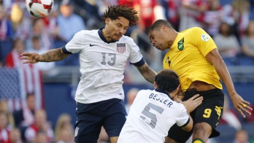 Por tercer ciclo consecutivo, Estados Unidos consiguió el primer lugar de la eliminatoria mundialista de la Concacaf, al imponerse el viernes 2-0 a Jamaica con goles de Graham Zusi y Jozy Altidore en el segundo tiempo. Estados Unidos, que había amarrado desde el mes anterior su séptimo boleto consecutivo a un Mundial, llegó a 19 puntos, una cifra inalcanzable para Costa Rica, que es segunda de la eliminatoria y que está también clasificada a Brasil 2014. Los ticos cayeron 1-0 ante Honduras, que se ubicaba en el tercer puesto, todavía sin el boleto directo al Mundial. Tanto la selección norteamericana como la jamaiquina disputaron un partido muy trabado en la media cancha durante los primeros 77 minutos, hasta que Alejandro Bedoya recibió el balón en un costado de la cancha y envió un centro a Zusi, cuyo disparo dentro del área fusiló al arquero caribeño DuWayne Kerr y entusiasmó a buena parte de los 18.467 espectadores congregados en Kansas City, muchos de los cuales asistieron al cotejo vestidos de rojo, blanco y azul. El público en el Sporting Park apenas volvía a ocupar sus asientos cuando que Edgar Castillo, quien al igual que Zusi entró a la cancha en un cambio, sirvió para Altidore, que quedó solo ante el arco y anotó el segundo tanto a los 81 minutos. Jamaica, que sólo ha participado en el Mundial de Francia 1998, quedó ya matemáticamente eliminado. Zusi, titular del Sporting de Kansas City, ingresó al comienzo del segundo tiempo, en sustitución de Landon Donovan, y fue ovacionado por los aficionados de casa. Retribuyó ese apoyo al anotar su segundo gol en cotejos internacionales. Altidore amplió su récord con la selección, al anotar por sexto cotejo consecutivo. Fue su octavo tanto del año y su cuarto en la eliminatoria.