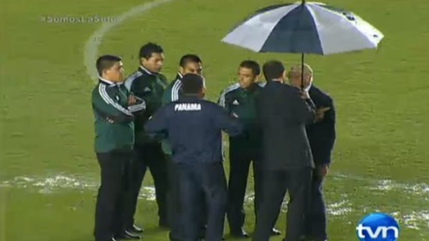 El cuarteto de árbitros y los comisarios encargados del partido entre Panamá y Jamaica observan el terreno del estadio Rommel Fernández para observar su estado. Aunque es un procedimiento habitual en todo partido oficial de fútbol, esta vez toma importancia dada la fuerte lluvia que cae en la ciudad de Panamá.