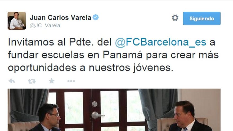 "Invitamos al Pdte. del @ FCBarcelona_es (Fútbol Club Barcelona) a fundar escuelas en Panamá para crear más oportunidades a nuestros jóvenes", escribió Varela en un breve mensaje en Twitter en la que adjunta una foto en que se le ve reunido con Bartomeu.