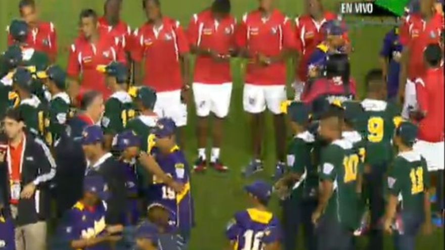 Jugadores de los equipos de béisbol de Panamá, que representaron a Latinoamérica en las series mundiales infantil e intermedia este año, saludaron al público y a los jugadores de la Selección de Fútbol panameña antes del juego contra Jamica. Los peloteros estrecharon las manos de los jugadores de la selección panameña y les muestran su respaldo antes del partido contra los jamaiquinos por las eliminatorias a la Copa del Mundo Brasil 2014. Ambos equipos de béisbol destacaron en esas series mundiales. El Infantil estuvo cerca de disputar la final internacional del torneo realizado en Williamsport, Pensilvania, y el Intermedio se coronó campeón mundial del certamen disputado en Bangor, Maine.