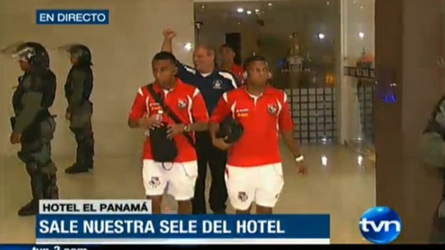 Los integrantes de la Selección de Fútbol de Panamá salen del Hotel El Panamá y abordan el autobús que los llevará al estadio Rommel Fernández. Los jugadores y los miembros del cuerpo técnico salieron del lugar mientras eran esperados por algunos fanáticos en el lobby donde eran aplaudidos por ellos. La salida del lobby era custodiada por agentes de la Unidad de Control de Multitudes.