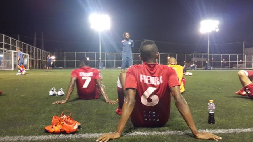 Los jugadores del equipo cubano entrenaron en la cancha del estadio Luis Ernesto "Cascarita" Tapia; durante esa sesión ensayaron tiros al marco.