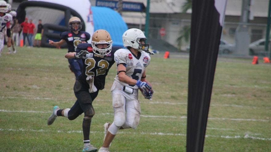 El corredor de poder del ECP Mighty Eagles Eduardo “Lalo” Tovar perdió el ovoide en una corrida ofensiva que provoco una perdida aprovechada magistralmente por Luis Felipe Valdor de Brader Raiders para sentenciar el triunfo por ocho a cero en la jornada de la Liga de Football Americano Juvenil del Club Kiwanis de Panamá.