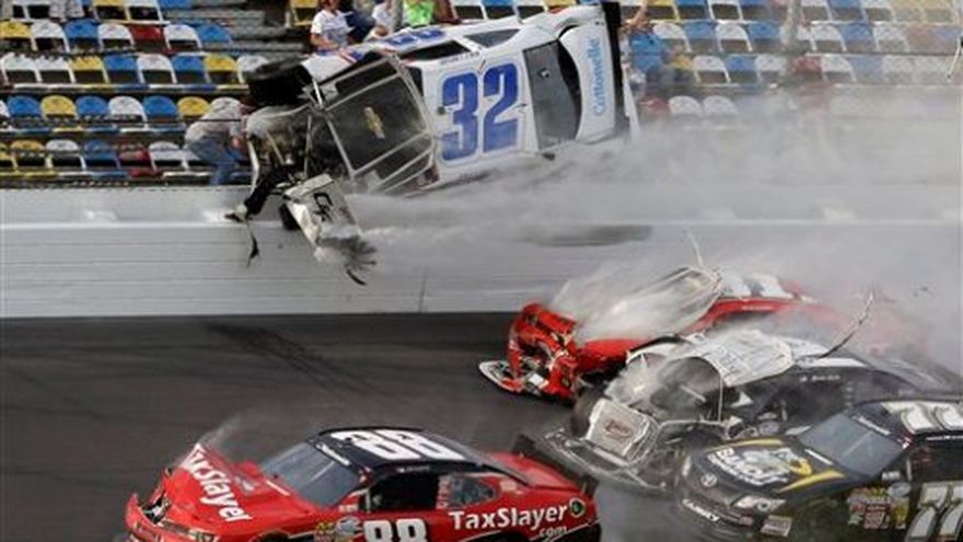 Al menos 12 aficionados que presenciaban una carrera de la NASCAR resultaron heridos el sábado en el circuito de Daytona cuando varios carros chocaron en la última vuelta y uno voló hasta la cerca de contención lanzando varios pedazos grandes, incluida un neumático, hacia las tribunas. En la colisión que ocurrió cuando los competidores se acercaban a la meta, el bólido del novato Kyle Larson salió disparado hacia la reja que separa la pista de los asientos. Varias piezas grandes del vehículo de Larson cayeron en las gradas. El carro terminó con la parte delantera desprendida, y el motor que ardía quedó atorado en un hoyo en la reja. El vocero del condado de Volusia, Dave Byron, confirmó que seis personas lesionadas de gravedad fueron llevadas en ambulancia al Centro Médico Salud Halifax en Daytona Beach. "Esos seis tienen la condición de pacientes con traumatismo", dijo Byron y agregó que una persona, no grave, fue trasladada al centro Halifax en Port Orange. Los responsables de NASCAR y del Circuito Internacional de Daytona no tuvieron de inmediato una información detallada sobre los heridos que dejó el accidente en la carrera realizada un día antes del comienzo de la temporada con la tradicional Daytona 500. Cuando los vehículos comenzaron a chocar en torno a Regan Smith y Brad Keselowski, el bólido Tony Stewart parecía perfilarse a la victoria, pero Larson impactó con Keselowski y su unidad salió volando hacia la reja. Cuando el carro de Larson se detuvo, ya no tenía toda la parte delantera. Larson, que tiene 20 años y que debutó esta semana en Daytona, parecía anonadado con las manos en la cintura a algunos metros (varios pies) de su vehículo, hasta que por fin fue llevado para que lo examinaran los médicos. Más tarde, dijo que antes que nada pensó en los aficionados. "Espero que todos los aficionados estén bien y que todos los pilotos estén bien", expresó Larson. "Recibí un par de fuertes golpes y vi que mi motor había desaparecido. Solamente espero que todos estén bien".