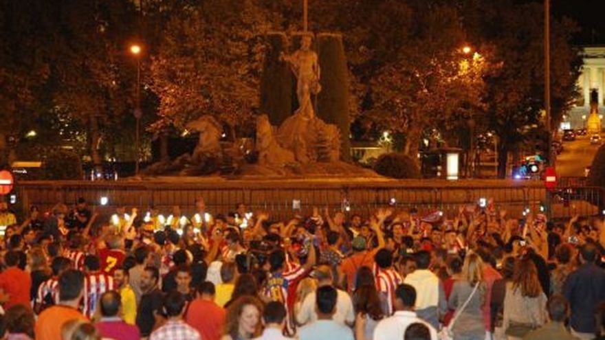 Tres meses después de celebrar su décimo título de liga en la plaza de Cánovas del Castillo, los aficionados del Atlético de Madrid regresaron hoy eufóricos junto a la estatua del dios Neptuno para festejar su segunda Supercopa española. La victoria por 1-0 sobre el Real Madrid -primera victoria en el Calderón sobre el vecino rival en 15 años-, en el partido de vuelta dio rienda suelta a la alegría rojiblanca, primero en el estadio Vicente Calderón y, minutos después, en el escenario clásico de la celebración de sus éxitos. Lo avanzado de la hora -el partido terminó pasadas las doce de la noche- y las vacaciones de agosto hicieron que la concurrencia a la fiesta fuera menor que otras veces. Unos trescientos centenares de seguidores rojiblancos se congregaron en las inmediaciones de la Carrera de San Jerónimo, aunque la Policía no tuvo necesidad de cortar el tráfico en la zona. Los aficionados rojiblancos recorrieron la zona a bordo de motos y coches enarbolando banderas y haciendo sonar el claxon. En esta ocasión, los seguidores del Atlético, con banderas y bufandas rojiblancas al viento, no pudieron disfrutar de la presencia de los jugadores, que no se sumaron a la fiesta en la fuente de Neptuno. El Atlético de Madrid había ganado su segunda Supercopa gracias a un gol del croata Mario Mandzukic en el segundo minuto de partido. Pese a la expulsión de su entrenador, Diego Simeone, a los 25 minutos por protestar y propinar palmaditas en el cogote al cuarto árbitro, el Atlético mantuvo su puerta a cero y se llevó la Supercopa.