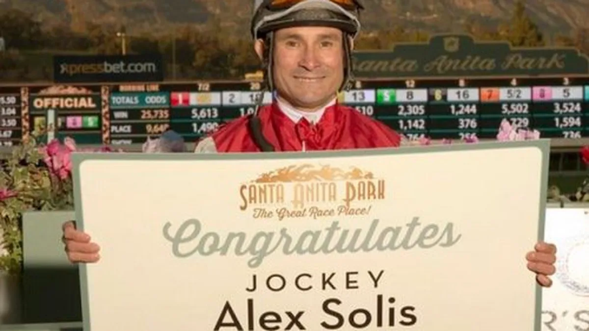 El jinete panameño Alexis Solís obtuvo su victoria 5,000 en la hípica estadounidense tras ganar la octava carrera de la programación de inicio del año 2015 ayer en el Santa Anita Park de Arcadia, California. Solís, quien tiene 28 años compitiendo en hipódromos de Estados Unidos, montó al ejemplar "Lutine Bell" en esa prueba en la que participaban potrancas de tres años de edad. La carrera se desarrolló en distancia de una milla y se pagó $79,250.00 al primer lugar. FOTO: Santa Anita