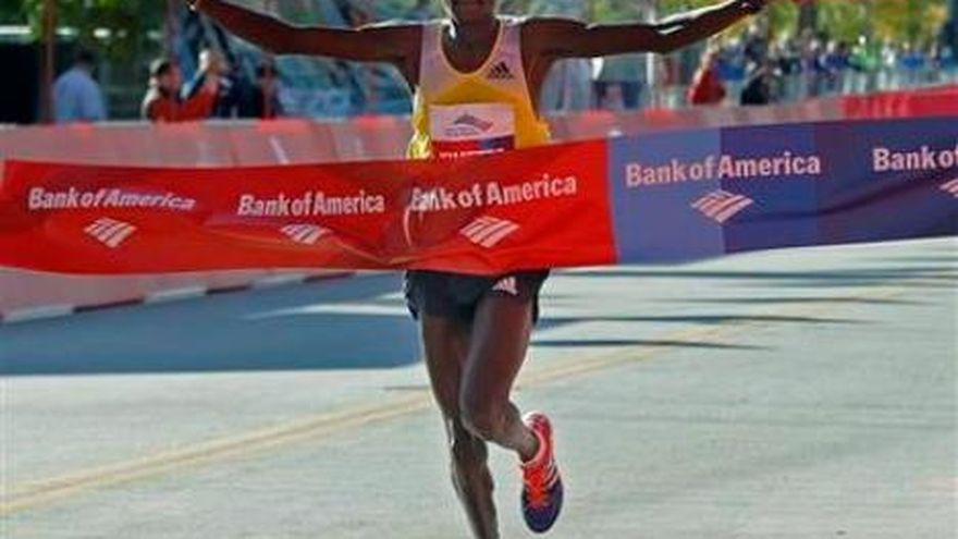 Dennis Kimetto, que de agricultor en Kenia se ha catapultado a la elite de los fondistas, se impuso el domingo en el Maratón de Chicago con récord de pista. Su compatriota Rita Jeptoo ganó la versión femenina. El de Chicago fue el primer maratón importante que se disputa en Estados Unidos desde la tragedia de Boston. Antes de la competencia se observaron 30 segundos de silencio en homenaje a las víctimas de los atentados. Asimismo más de mil policías uniformados y de civil custodiaron la carrera, algunos de ellos con perros entrenados para olfatear explosivos. Desde un puesto de comando se observaron las imágenes tomadas desde helicópteros y las 22.000 cámaras de la ciudad, el sistema de vigilancia más extenso en la nación. Kimetto completó el recorrido en 2 horas, 3 minutos y 45 segundos, superando la marca de 2:04:38 establecida por el etíope Tsegaye Kebede el año pasado. Se distanció de Emannuel Mutai en los últimos kilómetros (millas) y traspuso la meta solitario elevando los brazos al aire. Fue su segunda gran victoria del año junto con la de Tokio en febrero. Kimetto, que no hace mucho cultivaba maíz y atendía ganado vacuno en el pueblo de Eldoret, dijo por medio de un intérprete que había estado corriendo por su cuenta cuando tuvo la oportunidad de conocer a Geoffrey Mutai, un keniano astro del maratón. Mutai lo invitó a incorporarse a su campo deportivo cerca de Eldoret para entrenarse con él. Kimetto llegó segundo en su debut en el Maratón de Berlín el año pasado. Emmanuel Mutai (2:03:52), ganador en Londres en 2011, también superó el tiempo de Kebede pero terminó a siete segundos del ganador. Tercero fue Sammy Kitwara (2:05:16). Los tres primeros fueron de Kenia. Por su parte, Jeptoo sumó a su victoria en Boston su triunfo aquí con 2:19:57 después de haber perdido en un embalaje final hace un año. Jeptoo también llegó a la meta sin compañía. Segunda fue Jemima Sumgong Jelegat de Kenia (2:20:48), y tercera la rusa Maria Konovalova (2:22:46). "En 2006 gané en Boston pero después no anduve bien", dijo la ganadora. "Sin embargo el año pasado y este año estoy andando realmente bien. Cuando volví a correr Boston vi que se cumplía mi sueño. Esta es mi felicidad". Cada ganador se lleva un premio de 100.000 dólares. Kimetto ganó además 75.000 por el récord y Jeptoo otros 40.000 por terminar por debajo de 2:20:00.