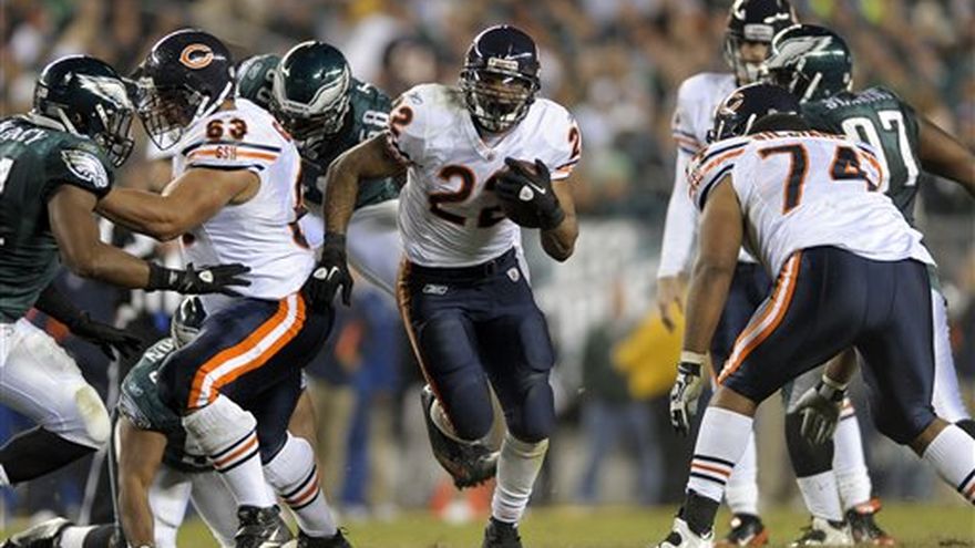 Matt Forte se recuperó de dos costosas pérdidas de balón y Jay Cutler sacó de apuros a los Bears de Chicago. Cutler conectó con Earl Bennett un pase de cinco yardas para el touchdown de la ventaja en el último período, Forte corrió para 133 yardas y los Bears derrotaron el lunes por 30-24 a los Eagles de Filadelfia. La derrota fue desastrosa para Michael Vick y los Eagles (3-5), que por cuarta vez en la temporada despilfarraron una ventaja en el cuarto período. Jeremy Maclin cayó y fue tacleado en la 30 de los Bears después de una atrapada de nueve yardas en cuarta y 10 cuando restaban menos de dos minutos en el reloj. Los campeones defensores de la División Este en la Conferencia Nacional van abajo de los Giants de Nueva York (6-2) por tres juegos. Chicago (5-3) consiguió su tercera victoria consecutiva, pero sigue tercero en la División Norte de la Conferencia Nacional, abajo de Green Bay (8-0) y Detroit (6-2). Luego del segundo fumble de Forte, LeSean McCoy anotó un touchdown con un acarreo de 33 yardas que puso adelante a los Eagles por 24-17 en el tercer período, pero los Bears respondieron con tres puntos en fila. Robbie Gould acertó un gol de campo de 38 yardas para reducir la diferencia a 24-20, y tres jugadas después la defensiva de Chicago forzó una patada. Los Bears avanzaron 51 yardas para lograr la anotación decisiva, cuando Cutler lanzó el pase de cinco yardas para touchdown a Bennett sobre Asante Samuel para darles la delantera por 27-24. Los Eagles llegaron a la 42 de los Bears en su siguiente ofensiva. En cuarta y seis, el pateador Chas Henry le dio un pase a Colt Anderson y Chicago tomó el control del partido. Un castigo por interferencia en pase sobre Nnamdi Asomugha en la siete de los Eagles prolongó la ofensiva siguiente. La defensiva cerró filas y Gould metió un gol de campo de 22 yardas para sellar el marcador en 30-24.
