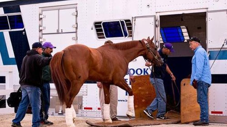 En esta imagen se aprecia al ejemplar California Chrome, que aborda un remolque que le traslada del hipódromo Pimlico, ubicado en Baltimore (Estados Unidos), rumbo hacia Belmont Park que será la sede del Belmont Stakes el próximo 7 de junio. California Chrome, que ganó las dos primeras pruebas de la triple corona estadounidense- el Derby de Kentucky y el Preakness Stakes-, tratará de convertirse en el primer ejemplar en 35 años que se queda con las tres gemas de la hípica en el país norteamericano. El equino fue autorizado ayer, por los jueces de la Asociación Hípica de Nueva York, para competir en la prueba con tiras en sus fosas nasales, las que utiliza en sus diferentes presentaciones. El Belmont Stakes se disputa en distancia de 2,400 metros y es la carrera más larga de las tres que componen la triple corona en Estados Unidos. Affirmed fue el último caballo en ganar las tres gemas estadounidenses en 1978. TEXTO: Lane Gold (twitter)