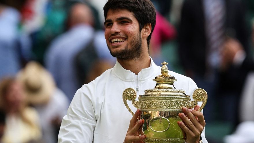 Carlos Alcaraz sostiene el trofeo de campeón de Wimbledon / AFP