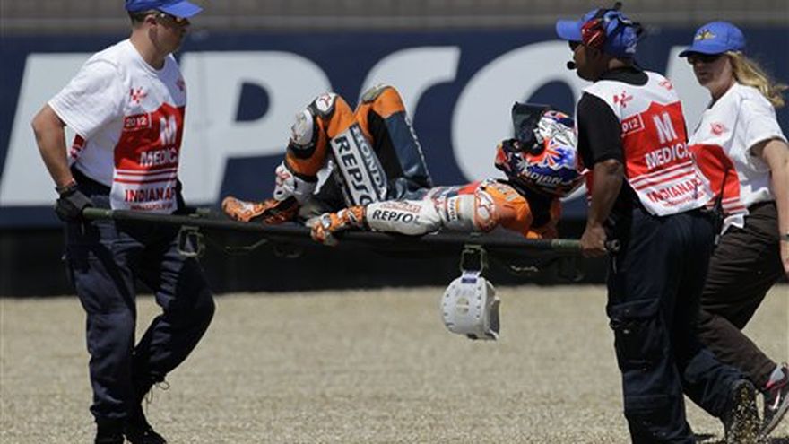El campeón mundial Casey Stoner tuvo un fuerte choque el sábado durante las pruebas de clasificación para la carrera de MotoGP en Indianápolis y fue sacado de la pista en camilla. La motocicleta del australiano se bamboleó al salir de una de las curvas del circuito de 4,22 kilómetros (2.621 millas). Stoner salió despedido y cayó sobre el asfalto. Se lastimó el tobillo izquierdo y fue examinado en el centro médico de la pista.