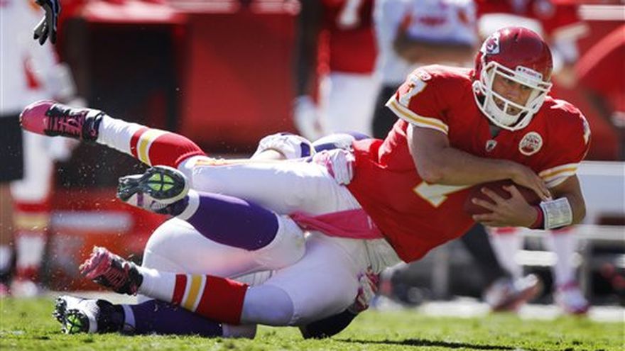 Los Chiefs de Kansas City consiguieron al fin su primer triunfo en la temporada, mientras que a los Vikings de Minnesota les hubiera gustado decir lo mismo. Matt Cassel envió en el último período un pase de 52 yardas que Dwayne Bowe transformó en touchdown, Ryan Succop estuvo perfecto en cinco intentos de gol de campo y los Chiefs vencieron el domingo por 22-17 a los Vikings. El certera pierna derecha de Succop ya le había dado a Kansas City (1-3) una ventaja de 15-10 al iniciar el último cuarto. Luego, Cassel retrocedió para lanzar, vio que Bowe eludió a Cedric Griffin, quien tuvo un resbalón, y envió la pelota a las manos de su wide receiver sobre la carrera. Bowe giró para quitarse el marcaje del safety Jamarca Sanford, luego se zafó de un tacleada de Griffen y trotó las dos últimas yardas hasta la zona de anotación. Minnesota tiene foja de 0-4.
