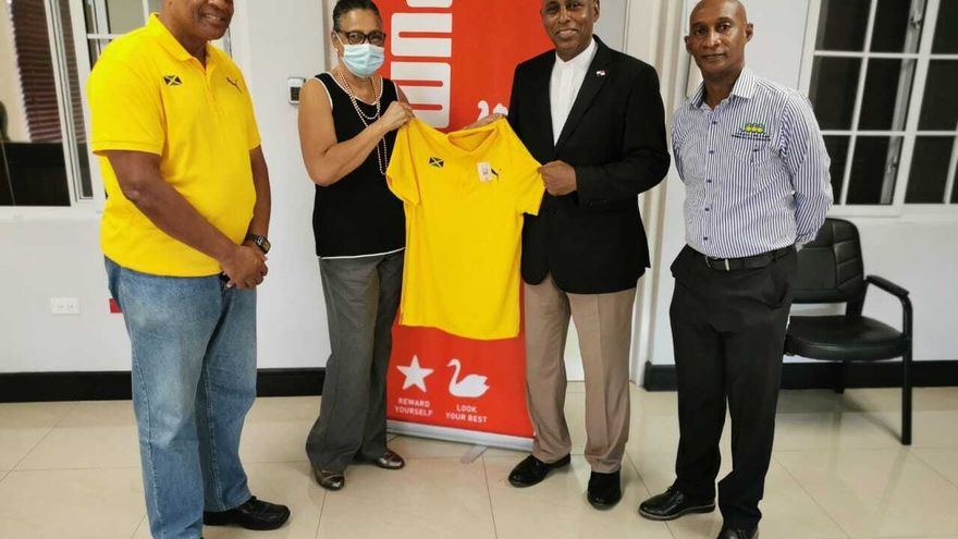 S.E. Dr. Lasford E. Douglas (der.), embajador de Panamá, recibió la camiseta oficial del equipo de atletismo de Jamaica de parte de la Sra. Marie Tavares (izq.), secretaria de la Jamaica Athletics Administrative Association (JAAA) junto a Brian Smith, secretario asistente y Garth Gayle, presidente de la JAAA.