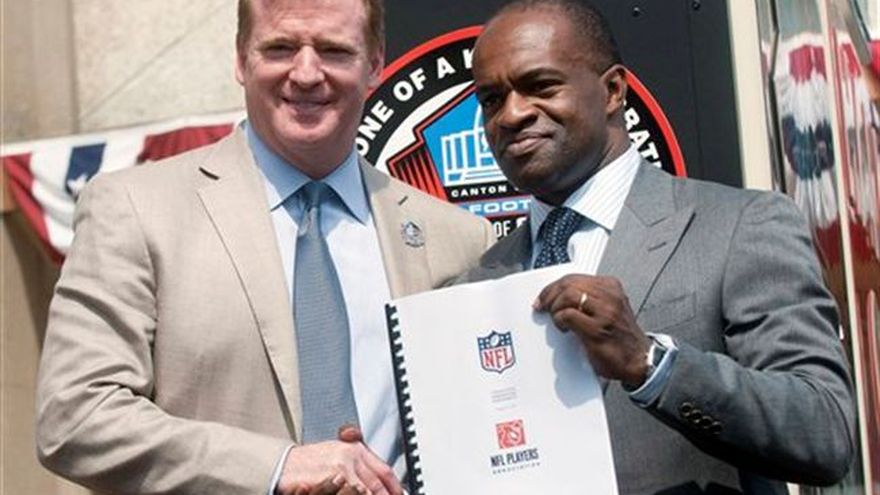 El comisionado de la NFL Roger Goodell y DeMaurice Smith, líder de la Asociación de Jugadores de la NFL, tomaron entre los dos el legajo de 300 páginas del acuerdo colectivo de trabajo entre jugadores y dueños y se dieron la mano posando para las cámaras. Así como así, se acabaron los amargos cuatro meses y medio de enojo y posturas encontradas durante el prolongado paro laboral de la NFL. Smith y Goodell firmaron la mañana del viernes el nuevo acuerdo colectivo de trabajo en un escenario en las escaleras del Salón de la Fama del Fútbol Americano, un detalle ceremonial luego que los jugadores acordaron ratificar el acuerdo laboral de 10 años la noche del jueves. Sin embargo, hubo una sensación de alivio tanto para Goodell como para Smith, que se estrecharon las manos tres veces durante la breve ceremonia e incluso se abrazaron luego de pasar casi medio año en tensas negociaciones para determinar una nueva forma de repartirse los amplios ingresos de la NFL. "Estamos tranquilos porque el fútbol americano está de regreso", dijo Goodell. "Eso es lo que quieren nuestros aficionados y eso es lo que todos queremos y estamos emocionados de que lo logramos". Un aficionado gritó "gracias" a Smith mientras tomaba su lugar. El líder sindical le respondió: "De nada". Luego de la rúbrica del documento entraron al foro de la cadena televisiva NFL Network dentro de la galería del Salón de la Fama. Con los bustos de los nuevos miembros como fondo, Smith y Goodell detallaron el viaje, en ocasiones difícil, hacia el nuevo acuerdo. Ninguno señaló un momento particular en las largas conversaciones. En cambio reconocieron el mérito de los dirigentes de ambos bandos, por haber sido capaces de encontrar un común denominador y que así se salvara la temporada de 2011. Goodell dijo que un pequeño grupo de representantes de los jugadores y los dueños hicieron el sacrificio de poner de lado las considerables diferencias entre ellos y se enfocaron en el futuro. "Hubo mucho respeto y un intento de encontrar soluciones", dijo Goodell. "Una vez que nos entendimos y entendimos que era eso para lo que nos reuníamos, logramos terminar el trabajo".