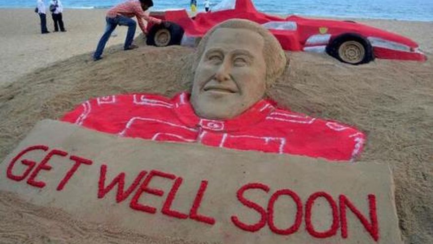 Con una escultura de arena en la playa de Puri, el arista indio Sudarsan Pattnaik, le desea al ex piloto alemán de la formula 1, Michael Schumacher, que mejore su estado de salud. El mayor campeón de la historia de la fórmula 1, que cumplirá 45 años el viernes, sigue en coma artificial en un hospital de Grenoble (sudeste de Francia), mientras surgen los primeros interrogantes sobre las circunstancias del accidente. Cuatro días después de la caída que sufrió cuando esquiaba en la estación alpina de Meribel, en los Alpes franceses, el piloto alemán permanece en la unidad de cuidados intensivos del hospital universitario de Grenoble, sin que se diera ninguna nueva información sobre su estado de salud, calificado la víspera de crítico pero “estable”. Ni el hospital ni la familia de Schumacher han informado sobre la evolución de su estado a las decenas de periodistas que se encuentran en el estacionamiento del servicio de urgencias del hospital. TEXTO: Milenio