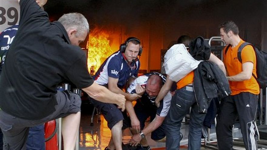 Dieciséis personas resultaron heridas, una de ellas con quemaduras graves, al estallar un incendio dentro del taller del equipo Williams de Fórmula Uno luego que el piloto venezolano Pastor Maldonado ganase el Gran Premio de España. El gobierno regional de Cataluña informó en una declaración que una persona fue llevada en helicóptero a un hospital en Barcelona con severas quemaduras, mientras que otras cinco fueron llevadas a un hospital local por inhalación de humo. Diez personas fueron tratadas en el Circuito de Cataluña por inhalación de humo. Williams confirmó que la persona llevada en helicóptero al hospital era miembro de la escudería, y que otros tres miembros fueron tratados. El incendio estalló poco después que Maldonado y su equipo se tomasen la tradicional foto de la victoria frente al taller. Maldonado fue fotografiado corriendo del garaje llevando a la espalda a su primo Manuel — que tenía una pierna enyesada. En la foto, Manuel Maldonado lleva el trofeo del Gran Premio en la mano izquierda. El director del equipo Williams, Frank Williams, que es parapléjico, fue sacado apresuradamente de su silla de ruedas. Ofrecía su primer discurso celebratorio en ocho años, coincidiendo además con el festejo de su cumpleaños 70. A su vez, el equipo Caterham indicó en una declaración que cuatro de sus empleados estaban entre los que fueron examinados en el centro médico del circuito, una de ellas con una herida menor en una mano y las otras tres por inhalación de humo. El automóvil del brasileño Bruno Senna, también de Williams, fue destruido en el incendio.
