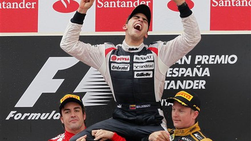 Pastor Maldonado mantuvo a raya a Fernando Alonso para ganar el domingo el Gran Premio de España de Fórmula Uno y dar a la escudería Williams su primera victoria en ocho años. Maldonado, quien arrancó en el lugar de privilegio de la parrilla de salida, contuvo sus nervios y resistió el reto del conductor español de Ferrari para ganar la prueba de 66 vueltas en el Circuito de Cataluña por 3,1 segundos. Maldonado se convirtió así en el primer piloto venezolano que gana una carrera en esta categoría del automovilismo. La 114ava victoria de Williams fue su primera desde 2004, en el Gran Premio de Brasil. "Es un día maravilloso para mí y el equipo. Una carrera inolvidable", dijo Maldonado, quien fue cargado en los hombros por Alonso y Kimi Raikkonen antes de ser bañado con champán en su primera visita al podio. "Fue una carrera dura, en la que batallamos con la estrategia y en un par de vueltas. Pero el auto fue tan competitivo desde la primera vuelta". Raikkonen, de Lotus, llegó 3.8 segundos atrás de Maldonado en la tercer posición, adelante de su compañero de equipo Romain Grosjean. Lewis Hamilton, quien fue enviado de la pole al último lugar en la parrilla de 24 autos debido a una violación del reglamento, terminó en el octavo lugar por la escudería McLaren. Kamui Kobayashi, de Sauber, ocupó la quinta posición, adelante del dos veces campeón defensor de F1 Sebastian Vettel, de Alemania, quien aceleró para pasar al Mercedes de Nico Rosberg para tomar el sexto lugar después de que tuvo una penalización durante la carrera. Hamilton terminó adelante de su compañero de equipo Jenson Button, con el piloto de Force India Nico Hulkenberg tomando los dos últimos puntos en la 10ma posición. Alonso regaló a los aficionados locales un arranque emocionante, cuando el dos veces campeón mantuvo su línea interior bajó presión de Maldonado. El español rodeó la primera curva mientras que Raikkonen aventajaba a Grosjean para colocarse en la tercera posición. Hamilton se sobrepuso a una problemática primera visita a los pits, cuando su equipo no pudo cambiar un neumático rápidamente, y se mantuvo dentro de la obtención de puntos. Llegó a estar en la quinta posición después de la segunda ronda de detenciones, cuando Maldonado arrebató la punta a Alonso, con Raikkonen aún adelante de Grosjean. La tercera detención de Maldonado estuvo lejos de ser airosa y perdió tiempo valioso, regresando a la pista atrás de Raikkonen, quien tomó el liderato cuando Alonso se detuvo por tercera y última ocasión. Pero Maldonado pasó a Raikkonen en la vuelta 47 para abrir una ventaja sobre Alonso, quien pasó al finlandés una vuelta después para mantenerse atrás de Maldonado. "Fue un arranque fantástico. Tomamos impulso ahí y encabezamos la carrera ... pero Williams se anticipó a nuestra parada (en los pits) y se fue al frente", dijo Alonso, quien por cuarta ocasión terminó en el segundo lugar aquí, donde ganó en 2006. "Intentamos en un par de ocasiones ponernos al frente pero fue imposible", agregó. Maldonado, de 27 años, condujo con confianza el último tramo a pesar de la presión de Alonso. "Hubo algunos momentos en los que (Alonso) estuvo tan cerca, pero manejé la ventaja", señaló Maldonado. Michael Schumacher quedó fuera de la competencia tras chocar con la parte posterior del auto Williams de Bruno Senna en la vuelta 14, empeorando la terrible temporada del piloto alemán al no lograr terminar la carrera por tercera ocasión, dejando además fuera al brasileño. Hamilton se mantuvo en el tercer lugar de la tabla de posiciones de pilotos, adelante de Raikkonen, al dirigirse al Gran Premio de Mónaco a realizarse el 27 de mayo. "Es una gran oportunidad para que nosotros estemos fuertes nuevamente", dijo Maldonado. "La consistencia será la cosa más importante este campeonato", añadió.