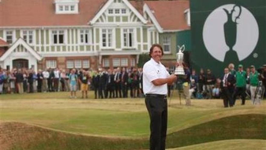Phil Mickelson conquistó el Abierto Británico con una reacción espectacular. El estadounidense cerró su actuación el domingo con una rueda de 66 golpes, cinco bajo par, igualando la mejor marca del torneo, mientras los demás candidatos, inclusive Tiger Woods, se quedaron cortos. La celebración comenzó cuando todavía había cuatro grupos por completar la rueda final. "Lefty" acertó birdies en cuatro de los últimos seis hoyos y coronó la rueda embocándola desde tres metros (10 pies) en el exigente hoyo 18 para llevarse su quinto título en los torneos grandes. De ese modo dejó atrás las frustraciones anteriores, como el mes pasado cuando terminó segundo en el Abierto de Estados Unidos nada menos que por sexta vez. En cuanto la pelota entró en el hoyo, Mickelson levanto sus puños al aire sabiendo que sería difícil que alguien alcanzara su total de 281 golpes, tres bajo par. Salió corriendo para abrazar a su esposa e hijos mientras su caddie no podía contener las lágrimas. "Este es un gran logro para mí", se entusiasmó el ganador. "Nunca supe si podría desarrollar el juego efectivamente. Me siento asombrado de ganar el trofeo habiendo jugado la que quizás fue la mejor rueda de mi carrera". Lee Westwood había empezado la cuarta rueda con dos golpes de ventaja pero sus posibilidades se frustraron cuando no pudo embocar un eagle en el hoyo 17. Adam Scott tuvo la delantera brevemente, pero cuatro bogeys seguidos pusieron fin a sus esperanzas de ganar un segundo título grande. Mickelson terminó con 281, seguido de Henrik Stenson (70) con 284 y otros tres competidores con 285, Ian Poulter (67), Adam Scott (72) y Westwood (75). Woods, que necesitó 74, terminó con 286. Después de una rueda promisoria de 69 golpes el jueves, cada día fue subiendo la cifra: 71, 72 y 74. El argentino Angel Cabrera firmó una tarjeta de 74 y terminó con un total de 288 golpes, cuatro bajo par. Sus tres vueltas anteriores habían sido de 69, 72 y 73. Woods, que estaba en condiciones de ganar un título grande desde su crisis en su vida personal, anduvo a los tumbos con su rueda final de tres sobre par y nunca estuvo en la contienda. Ya lleva 17 torneos grandes sin ganar, y su búsqueda del récord de Jack Nicklaus de 18 majors -Woods tiene 14- no parece muy promisoria. "Sentí que estaba jugando bien hoy, en realidad toda la semana", comentó Woods, que no ha bajado de 70 en la rueda final de sus siete últimos majors. "Pegué buenos remates y esta semana estaba en control de la pelota. Sólo trataba de regular la velocidad, y no lo conseguí". Una muestra de lo exigente de este escenario es que solamente un golfista, Mickelson, estuvo debajo de par, y uno solo en par, Stenson. Todos los demás estuvieron por encima. En total, Mickelson tiene ocho segundos puestos en los torneos grandes. Ahora, a los 43 años, finalmente inscribe su nombre en el trofeo del Británico, equivalente a tres cuartas partes de un Grand Slam y se asegura un puesto entre los mejores golfistas. Mickelson empezó su notable reacción con un birdie de 2,40 metros (8 pies) en el hoyo 13 para que su total quedara en par. Pero eso fue apenas el comienzo. En el hoyo 14 embocó otro birdie de 6,50 metros (20 pies). En el hoyo siguiente, de par 5, hizo uno más y cerró el último hoyo para cerrar con su total de tres bajo par. "Phil debe haber jugado realmente bien", comentó Westwood. "Cinco bajo par es una buena rueda de golf esta tarde".