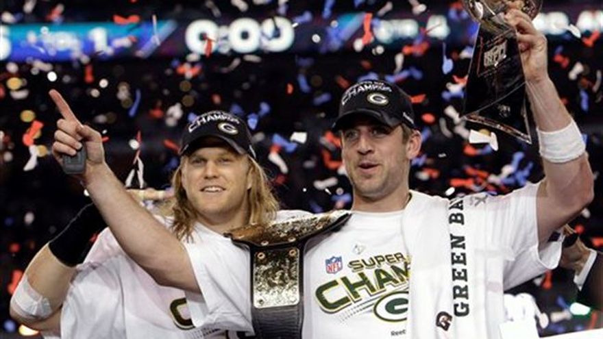 Green Bay tiene un nuevo ídolo: Aaron Rodgers. Coronando una de las postemporadas más sensacionales para un quarterback, Rodhers condujo el domingo a los Packers a su primer campeonato de la NFL en 14 años al vencer 31-25 a los Steelers de Pittsburgh. Los Packers vuelven a ostentar el trofeo Vince Lombardi, uno que lleva el nombre del legendario entrenador que les dio los dos primeros cetros. Rodgers, el Jugador Más Valioso del partido, hizo vibrar a los aficionados de los Packers con una espectacular racha triunfante de seis partidos que sin duda alguna enterrará los últimos vestigios de la amargura provocada por la salida de Brett Favre en Green Bay. Ya igualó a Favre en títulos y de paso estiró a 13 el récord de títulos de los Packers en la NFL, nueve antes de la era del Super Bowl. "Es lo que soñaba cuando de niño veía a Joe Montana y Steve Young," declaró Rodgers. "Hemos ganado un Super Bowl". El mariscal de campo de los Packers completó tres pases de touchdown, dos a Greg Jennings, y los Packers (14-6) salieron adelante tras más lesiones, sacaron una ventaja 21-3 y luego aguantaron para convertirse en el segundo equipo con la sexta preclasificación que se consagra. Por coincidencia de la vida, los Steelers de 2005 fueron los otros. Pittsburgh estuvo abajo 21-3 poco antes del descanso, pero con una gran actuación de su quarterback Ben Roethlisberger se acercó 28-25 al promediar el cuarto periodo con un pase de touchdown y sumar dos puntos en la conversión. Roethlisberger tuvo otra oportunidad. Forzado a avanzar 87 yardas con 1:50 por jugar, el mariscal no logró traspasar el balón del mediocampo. Luego que los Packers agotaron los últimos segundos, Rodgers —consagrado como el Jugador Más Valioso del partido— se apoderó del balón y empezó a saltar de alegría. Bajo una lluvia de confeti y serpentinas doradas, se fundió en un abrazo con su compañero Clay Matthews Jr. en el centro de la cancha del estadio en el norte de Texas. "Este es un día fabuloso para ser fabulosos", dijo Jennings. "Hemos sido un equipo que todo el año logró superar adversidades", añadió. "Nuestra capitán se lesiona, con la voz quebrantada en el vestuario. Nuestro principal adversario se lesiona, muchas emociones en el vestuario. Pero supimos encontrar la forma de inspirarnos en eso para emplearlo en el campo". "Vince Lombardi regresa a Green Bay", dijo el comisionado de la NFL Roger Goodell al entregar el trofeo al equipo. Esta fue apenas la segunda vez que Pittsburgh sucumbe en un Super Bowl. Los Steelers se mantienen como el equipo más laureado con seis y comparten el récord de más presentaciones con ocho. Green Bay dominó la primera mitad, en la que Rodgers lanzó dos pases de touchdown. Bisoños en este tipo de citas, los campeones de la Conferencia Nacional arrancaron a todo vapor. Se suponía que Pittsburgh era el equipo de la experiencia —su tercera presencia en seis años— pero su primer tiempo estuvo marrado por lesiones y descuidos con el balón. Muy bien se hubiesen puesto a lamentarse con la cantante Christina Aguilera, quien se equivocó con la letra al entonar el himno nacional. Green Bay sacó ventaja 14-0 con touchdowns en jugadas sucesivas: un touchdown de 29 yardas gracias a la atrapada de Jordy Nelson y luego un pase interceptado de Nick Collins. Rodgers aumentó la diferencia 21-3 al conectar un pase de 21 yardas a Greg Jennings. El ovoide pasó zumbando cerca del safety Ryan Clark. Jennings hizo ver fácil un exigida atrapada. Esa ofensiva se propició tras una intercepción de Jarret Bush en el medio del campo. Roethlisberger fue de menos a más. Luego del touchdown de Jennings, Roethlisberger orquestó una ofensiva desde bien atrás de su territorio, que incluyó un pase de 37 yardas a Antwaan Randle El. Pittsburgh culminó una avance de 77 yardas con siete jugadas con un pase de touchdown de ocho yardas atrapado por Hines Ward. Las lesiones afectaron a ambos. Los Steelers sufrieron las bajas del tackle derecho Flozell Adams (hombro), el cornerback Bryant McFadden (cadera) y el receptor Emmanuel Sanders (pie) por golpes. McFadden y Adams reaparecieron posteriormente. En Green Bay, su receptor Donald Driver salió con un golpe en el tobillo y su cornerback Charles Woodson quedó fuera al fracturarse la clavícula izquierda. La concurrencia de 91.060 espectadores que pagaron entrada o 103.219 al sumar a los "acreditados". Pero se quedó corta del récord. El primer Super Bowl en el Estadio de los Cowboys, una impresionante estructura que costó 1.200 millones de dólares, coronó una semana con un clima de nieve y frío que provocó toda clase de inconvenientes. Las cosas tampoco salieron a pedir de boca el día del partido, ya que se declaró insegura una zona de butacas temporales. Aproximadamente 1.250 aficionados fueron cambiados de lugar: 400 a quienes no se les permitió permanecer dentro del estadio y 850 que fueron colocados en otro sitio dentro del mismo. Varios famosos y políticos concrrieron. Estaba el ex presidente George W. Bush y el jugador de béisbol Alex Rodríguez, a quien se le vio cuando la actriz Cameron Díaz le daba palomitas de maíz. Como siempre, fue un derroche de espectáculo que coronó una temporada en el que la liga alcanzó nuevas cumbres de popularidad, pese a una serie de tribulaciones fuera de la cancha. Ahora se abre el compás a la incertidumbre ante la amenaza de una paralización debido a que los dueños de equipos y los jugadores no se han puesto de acuerdo en torno a un nuevo contrato colectivo.