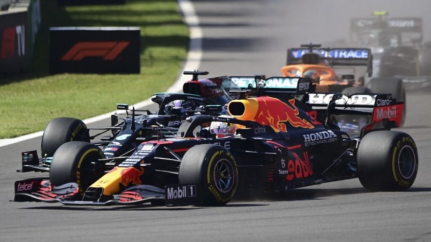 Atacado por el británico por el exterior en la vuelta 48, Verstappen defendió con agresividad y llevó a su adversario -y él mismo- fuera de la pista durante unos instantes.