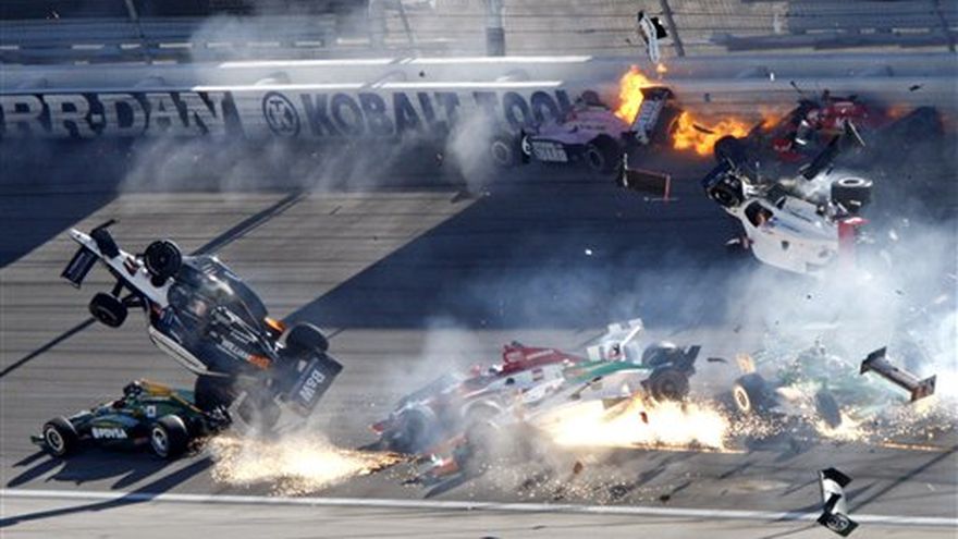 Dan Wheldon, el campeón de las 500 Millas de Indianápolis, murió el domingo en Las Vegas después que su bólido volara en un choque múltiple de 15 autos y terminara estrellándose contra una cerca durante la undécima vuelta de la última carrera de la temporada de la IndyCar. El piloto inglés de 33 años había ganado dos veces las míticas 500 Millas, incluyendo la edición del 2011. Fue transportado en helicóptero al University Medical Center. Los pilotos fueron informados de la muerte de su colega dos horas después del terrible choque, que muchos de ellos consideraron el peor que han visto. Otros tres pilotos, entre ellos el contendiente por el título Will Power, resultaron heridos en el accidente ocurrido en la undécima vuelta. "La IndyCar anuncia con mucha tristeza que Dan Wheldon falleció debido a lesiones de las que no podía sobrevivir", dijo Randy Bernard, el director de la serie. "Nuestros pensamientos y oraciones están con su familia hoy". "La IndyCar, sus pilotos y propietarios han decidido poner fin a la carrera", agregó. Después, los pilotos —muchos llorando— dieron cinco vueltas en su honor alrededor del óvalo. "En un instante bromeabas en las presentaciones de los pilotos. Y al siguiente Dan ya no está con nosotros", dijo Dario Franchitti, cuya esposa, la actriz Ashley Judd, le tuvo que traer una caja con pañuelos de papel. "He perdido, hemos perdido, a un buen amigo. Todos en la IndyCar le considerábamos como un gran amigo. Era una magnífica persona. Era alguien muy cumplido". Wheldon precisaba ganar en Las Vegas para llevarse un premio de cinco millones de dólares. Esta era la 134ta carrera en que participaba, aunque apenas la tercera en la temporada. El inglés arrancó en la parte trasera del grupo, pero rápidamente avanzó a través de los 34 pilotos antes del choque. El auto de Townsend Bell se volcó y otros quedaron en llamas, en medio de escombros esparcidos casi a la mitad de la recta del óvalo de 2,41 kilómetros (1,5 millas). Algunas de las zonas de impacto quedaron en tal mal estado que los empleados de mantenimiento tuvieron que poner parches en el asfalto. Las imágenes de video mostraron cuando el auto de Wheldon volaba por los aires hasta irse contra una cerca situada sobre la barrera de protección. La cuadrilla de primeros auxilios llegó de inmediato al lugar. "Nunca había visto algo similar", dijo Ryan Briscoe. "Parecía una escena de guerra de (la película) Terminator o algo así. Había pedazos de metal encendidos en llamas en medio de la pista. Escombros por todas partes. Daba miedo. Lo primero que se te venía a la mente era esperar que nadie hubiese salido herido porque había de todo por todas partes. Una locura". También resultaron heridos JR Hildebrand y Pippa Mann. Ambos permanecerán hospitalizados durante la noche. IndyCar informó que Mann sufrió quemaduras en el dedo pequeño de la mano derecha y será dada de alta por la mañana. Hildebrand está consciente, pero estará bajo observación. Power fue examinado y dado de alta. La autopsia de Wheldon se hará el lunes. IndyCar no había tenido una tragedia fatal desde la muerte de Paul Dana durante un ensayo previo en Homestead en 2006. Dio la impresión que el accidente se originó cuando el bólido de Wade Cunningham serpenteó en la pista y Hildebrand tocó la parte trasera del lado izquierdo de Cunningham. El bólido de Hildebrand pareció que se levantó y el Cunningham se estrelló contra el muro, desatando una reacción en cadena con todos los demás que venían atrás. Algunos redujeron la velocidad, pero otros no lo hicieron. Otros hicieron trompos frente a Wheldon y Power. Power pareció que voló por encima del bólido de Alex Lloyd, quedando ensartado en la cerca. La cámara interna mostró que uno de los neumáticos delanteros se desprendió hasta quedar casi incrustado en la cabina. "Fue como una escena de película que intentaran hacer lo más enmarañada posible", dijo Danica Patrick, quien disputa su última prueba de IndyCar. "Había escombros por toda la pista, uno podía oler el humo; se veía el humo atrás directo del auto. Había una parte con fuego que teníamos que esquivar. Uno podía ver los autos desperdigados". Los pilotos habían estado preocupados por las altas velocidades en la pista, donde estuvieron alcanzando casi los 360 kilómetros por hora (225 millas por hora) durante las prácticas. Sus temores se volvieron realidad cuando se produjo el contacto en la segunda curva, el cual hizo volar algunos autos. Chocaron entre ellos y luego contra la barda externa y la reja de seguridad. Wheldon, quien se radicó en Estados Unidos en 1999, ganó 16 carreras en la IndyCar y fue el campeón de la temporada de 2005. Aunque ganó la reciente Indy500, Wheldon no pudo conseguir un equipo fijo esta temporada. Logró ganarse una plaza en la carrera del domingo gracias a la promesa de Bernard de otorgar un premio de cinco millones de dólares a un piloto sin empleo que pudiera ganar la prueba. Aunque nadie aceptó la oferta, Bernard no renunció a la idea y Wheldon fue declarado candidato a obtener el premio. Lo ocurrido estropeó la coreografía montada por Bernard para el cierre de la temporada de la atribulada IndyCar. En su segundo año al frente de la serial, él puso todo su empeño en convertir la última carrera en un espectáculo total y hasta le ofreció a los directivos renunciar si la ABC —el canal de televisión a cargo de la transmisión para Estados Unidos— no lograba un determinado nivel de audiencia. Su objetivo era levantar la teleaudiencia para darle impulso a la temporada de 2013, en el que se esperaba estrenar nuevos modelos.