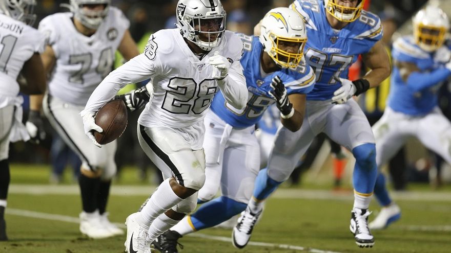 El corredor Josh Jacobs hizo un acarreo de 18 yardas a falta de 1:02 minuto para el final del tiempo reglamentario y los Raides de Oakland se impusieron por 26-24 a los Chargers de San Diego en partido adelantado de los jueves correspondiente a la Semana 10 de la Liga Nacional de Fútbol Americano (NFL).