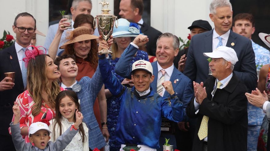 Alvarado, de 38 años, celebró así su primera victoria en la prueba más emblemática de la hípica estadounidense.