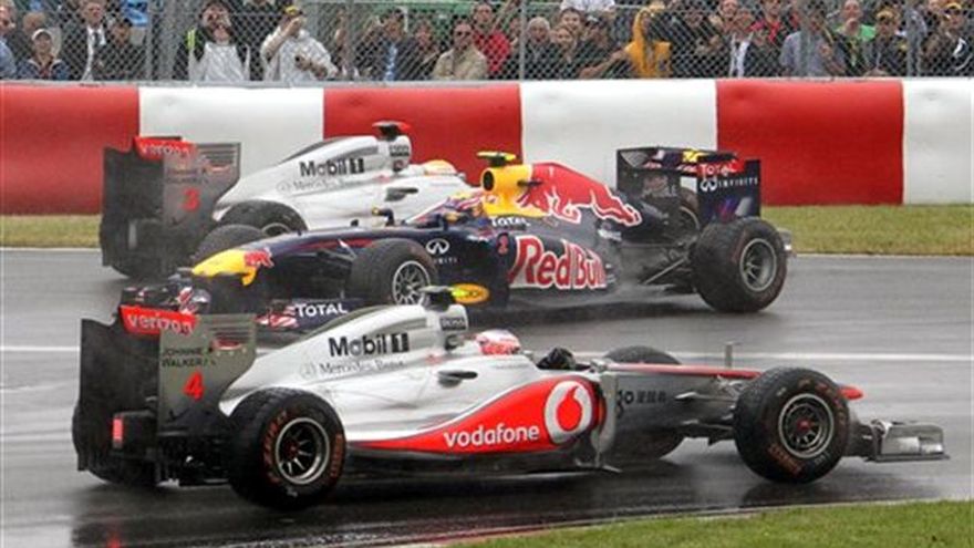 Jenson Button rebasó en la última vuelta a Sebastian Vettel para llevarse la victoria el domingo en un caótico Gran Premio de Canadá. El alemán Vettel había ganado cinco de las primeras seis carreras del mundial de Fórmula Uno esta temporada y el piloto de Red Bull marcó el paso al frente en casi todas las 70 vueltas en el circuito Gilles Villeneuve. Pero Button, segundo en Montreal el año pasado, entró a la última vuelta un segundo atrás de Vettel. Pero el británico condujo sensacionalmente su Red Bull para cruzar primero la meta al aprovechar un parpadeo de Vettel. El otro Red Bull, conducido por el australiano Mark Webber, entró tercero. El seis veces campeón Michael Schumacher fue cuarto. Vettel sigue cómodamente al frente del campeonato, con 60 puntos de ventaja sobre Button. Fue una carrera cargada de percances, en la que el auto de seguridad ingresó a pista cinco veces y hasta estuvo postergada dos horas por una torrencial lluvia. Vettel largó en la primera posición y su único obstáculo al comienzo fue el mal clima, que interrumpió la carrera tras la vuelta 25. Aunque el inicio fue lento, con los pilotos optando por ser conservadores con una pista mojada y escasa visibilidad, la carrera fue más emocionante en las últimas 10 vueltas. Button, quien salió séptimo, logró ascender gracias a que arriesgó más temprano con el cambio de neumáticos. El español Fernando Alonso (Ferrari) abandonó tras un choque con Button poco después que la carrera se había reiniciado luego de la demora por lluvia.
