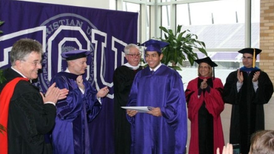 El nadador panameño Edgar Crespo recibió el título de bachiller en Administración de Negocios dentro de la Universidad Cristiana de Texas (TCU) en una ceremonia que se llevó a cabo hoy en el John Justin Center. Crespo tuvo que recibir su diploma aparte de sus compañeros de clases debido a que la graduación se realizó en los días en los que competía por Panamá en el Campeonato Mundial de Natación en Piscina Corta que se disputó en la ciudad de Estambul, Turquía. "Estoy realmente triste por no haber podido estar aquí con mis amigos cuando se graduaron. Sin embargo esto significó mucho para mí y lo agradezco sinceramente", declaró el nadador a la página web de TCU. El canciller Víctor J. Boschini fue quien le entregó el diploma a Crespo. Los acompañaron miembros del cuerpo de instructores del equipo de natación y clavados de ese campus, además de dirigentes universitarios. SATISFECHO POR SU DESEMPEÑO En relación a su participación en el Mundial realizado en tierras turcas, Crespo expresó que su trabajo fue satisfactorio, ya que mejoró sus tiempos en piscina corta. "Nadé los mejores tiempos que he tenido en piscina corta. Aún hay mucho por mejorar entre este momentos y los próximos cuatro años. Siento que realmente estoy en una buena posición." El nadador terminó en el puesto 28 dentro de los heats eliminatorios de los 100 metros estilo pecho, con tiempo de 59.68 segundos. Además culminó en el lugar 27 dentro de las pruebas clasifictarias de los 50 metros pecho al detener el cronómetro en 27.56 segundos. FOTO: gofrogs.cstv.com
